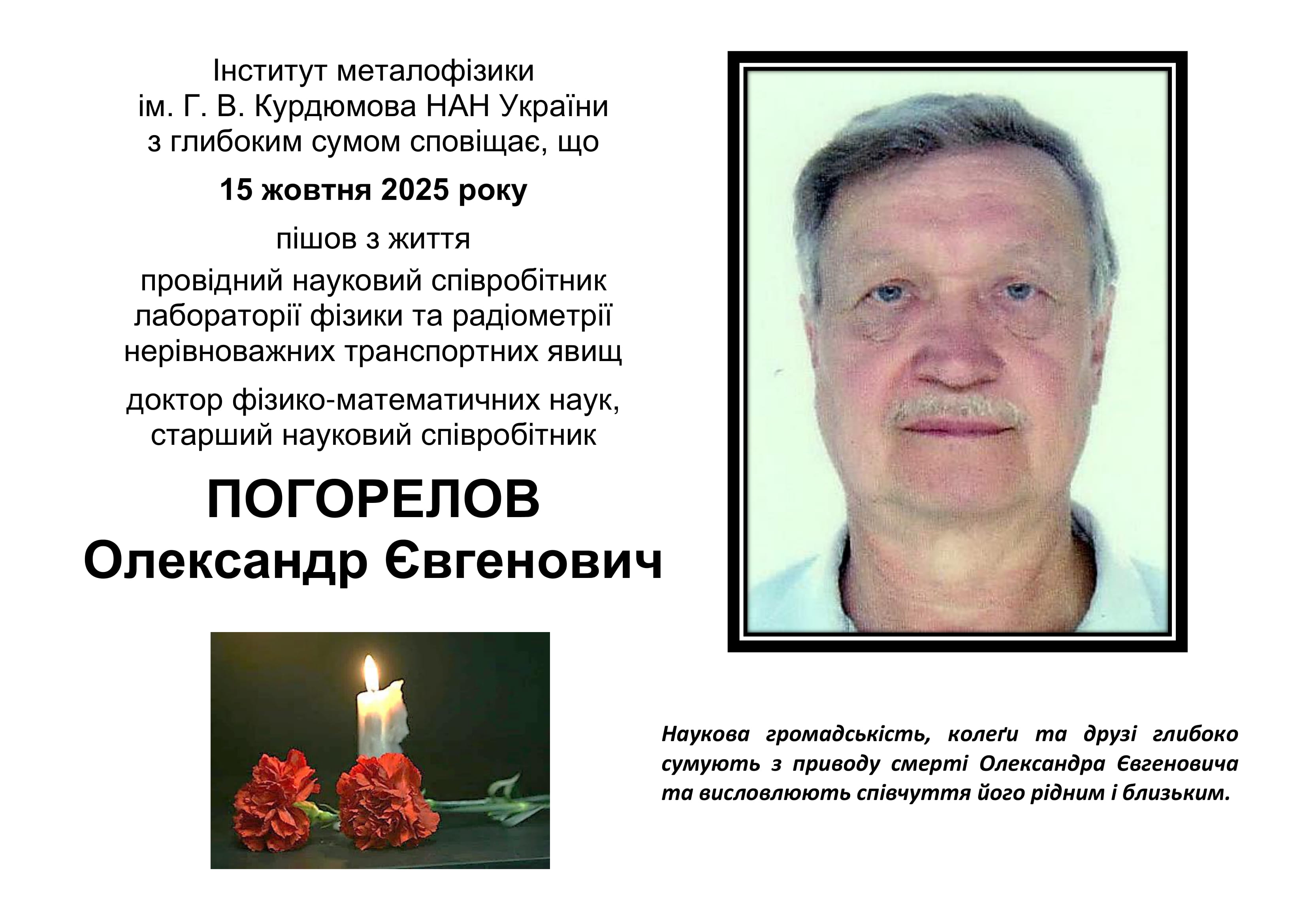 ім. Г. В. Курдюмова НАН України з глибоким сумом сповіщає, що 8 січня 2018 року на 78 році пішов з життя завідувач відділу електронної структури та електронних властивостей (30), доктор фізико-математичних наук, професор НИЩЕНКО МИХАЙЛО МАРКОВИЧ |